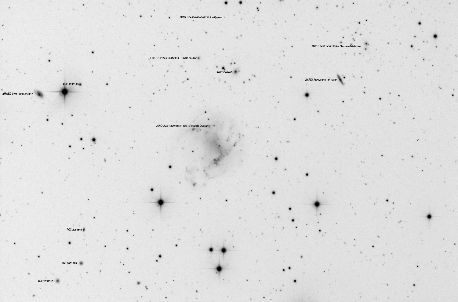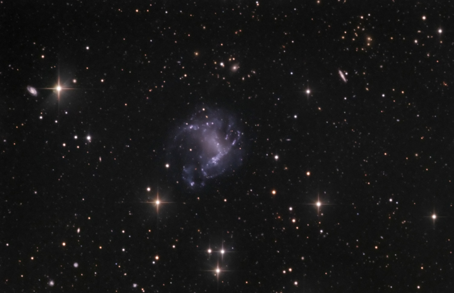 | The Spider Galaxy, UGC 5829 [A 1039+34/DDO 84/PGC 31923], is a low surface brightness, gas-rich quiescent irregular dwarf galaxy in Leo Minor. It is located at RA: 10h 42m 42s Dec: +34 26'56"(eq. 2000), approximately 26 million light years from Earth. This object has been studied infrequently over the years, with only 60 references listed by Simbad through 2010. It has rarely been imaged other than as part of general surveys such as the Palomar Observatory Sky Survey (NGS-POSS) and Sloan Digital Sky Survey (SDSS). As in the case of most deep images outside the plane of the Milky Way, in the field of view there are numerous background objects. These include galaxies such as 2MASXJ1041594+343147 and 2MASX J10425345+3419334; clusters of galaxies such as NSC J104251+341738 (+- 1.5 billion light years); and Quasar SDSS J104220.43+342136.9 (+- 10 billion light years) and Quasar Candidate USNO-A2.0 1200-06571136. The annotated version has several of these objects identified. Image acquisition dates: March 4, 5, 6, 7, 8, 11 and April 5, 6, 8, 9, 10, 11, 2010. Camera: SBIG STL6303E Filters: AstroDon LRGB Camera control software: CCDSoft Guiding/adaptive optics: AO-L, STL internal guiding chip. Camera temperature: -20C and -10C Image Acquisition Software: CCDAP4 Telescope: RCOS 16 Carbon Tube, Aries optics, F9 with Field Flattener Telescope control software: RCOS TCC, TheSky6, Focusmax Mount: Paramount ME (MKS 4000) Subexposures: Total exposure time: 43 hours Luminance: 18 hours [10 minute subexposures] unbinned RGB: 8.5 hours each [10 minute subexposures] binned 2x2 Conditions: Seeing conditions ranged from 1.5 to 3 arc seconds. FWHM of combined Luminance data: 2.6 arc sec. Processing: CCDStack2beta, Photoshop CS4. Due to its low surface brightness, the object required a great deal of exposure time. The need to collect data over a large number of nights resulted in much of the data being collected during periods of soft seeing, and limited the aggressiveness of the processing. Image appeared in October 2010 issue of Astronomy Magazine. |